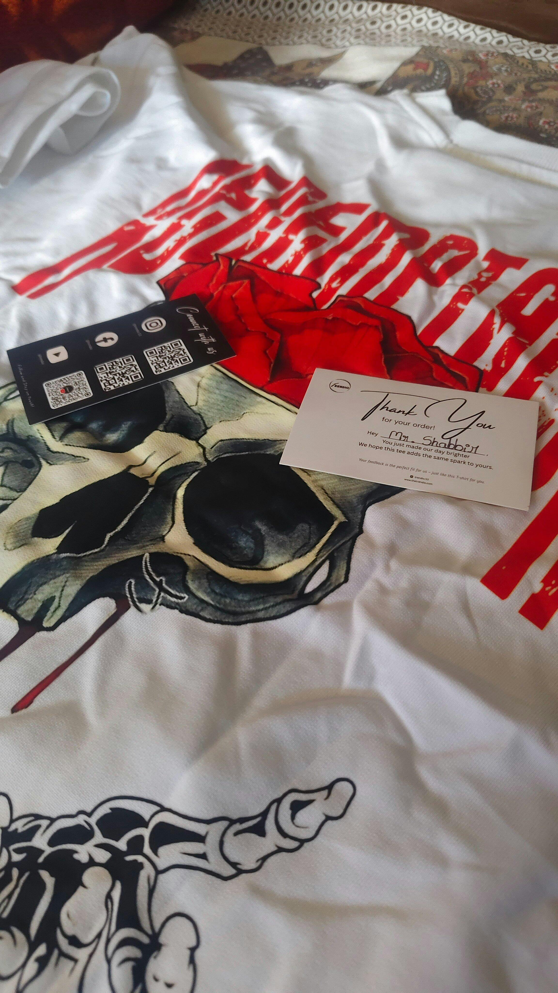 ✅Bold Graphic Design: Skull with red rose + dripping effect & Redemption text